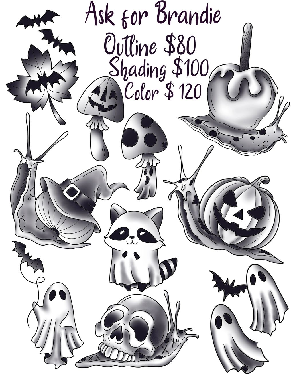 Halloween Tattoo Special by Brandie! prices ranging from $40 - $150. Please message the shop on Facebook messenger or Brandie on